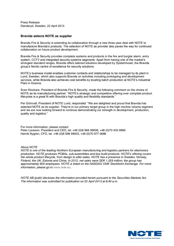 Sven Klockare, President of Bravida Fire & Security, made the following comment on the choice of NOTE as its manufacturing partner: "NOTE's strategic and competitive offering over complete product lifecycles is a great fit with Bravida's high quality and flexibility standards."