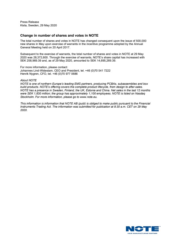 Subsequent to the exercise of warrants, the total number of shares and votes in NOTE at 29 May 2020 was 28,372,600. Through the exercise of warrants, NOTE’s share capital has increased with SEK 258,969.39 and, as of 29 May 2020, amounted to SEK 14,695,269.39.