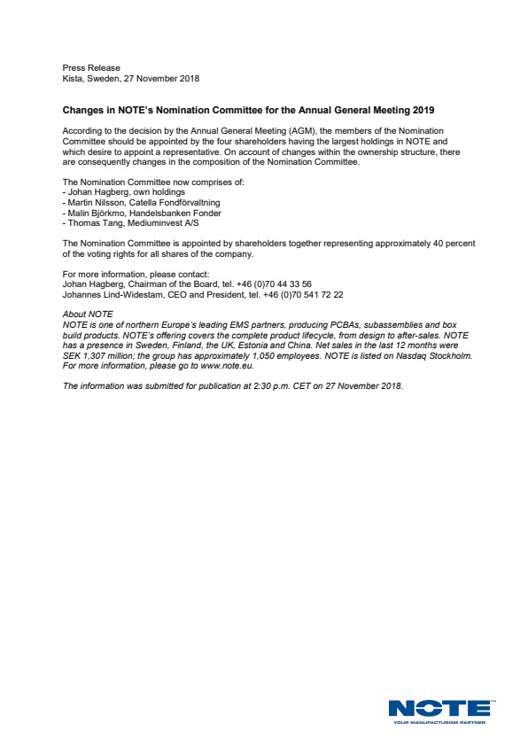 According to the decision by the Annual General Meeting (AGM), the members of the Nomination Committee should be appointed by the four shareholders having the largest holdings in NOTE and which desire to appoint a representative. On account of changes within the ownership structure, there are consequently changes in the composition of the Nomination Committee. ...
