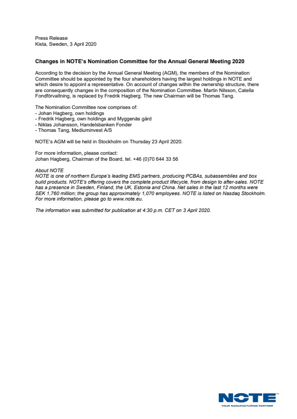According to the decision by the Annual General Meeting (AGM), the members of the Nomination Committee should be appointed by the four shareholders having the largest holdings in NOTE and which desire to appoint a representative. On account of changes within the ownership structure, there are consequently changes in the composition of the Nomination Committee. Martin Nilsson, Catella Fondförvaltning, is replaced by Fredrik Hagberg. The new Chairman will be Thomas Tang.