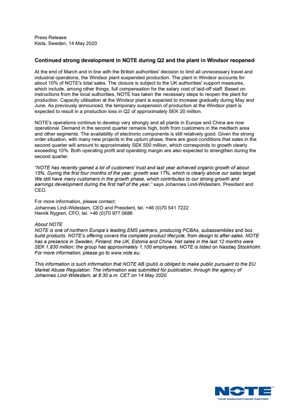 At the end of March and in line with the British authorities' decision to limit all unnecessary travel and industrial operations, the Windsor plant suspended production. The plant in Windsor accounts for about 10% of NOTE's total sales. The closure is subject to the UK authorities' support measures, which include, among other things, full compensation for the salary cost of laid-off staff. Based on instructions from the local authorities, NOTE has taken the necessary steps to reopen the plant for production. Capacity utilisation at the Windsor plant is expected to increase gradually during May and June. As previously announced, the temporary suspension of production at the Windsor plant is expected to result in a production loss in Q2 of approximately SEK 20 million.