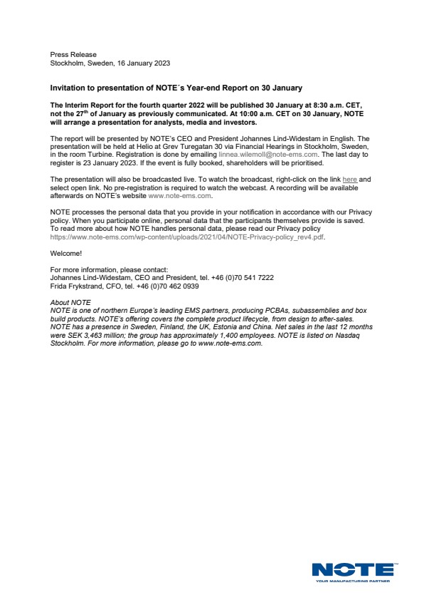 The Interim Report for the fourth quarter 2022 will be published 30 January at 8:30 a.m. CET, not the 27th of January as previously communicated. At 10:00 a.m. CET on 30 January, NOTE will arrange a presentation for analysts, media and investors.
