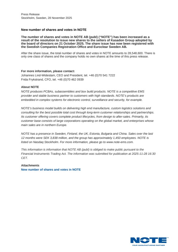 The number of shares and votes in NOTE AB (publ) (“NOTE”) has been increased as a result of the resolution to issue new shares to the sellers of Kasadon Group adopted by the board of directors on 21 October 2025. The share issue has now been registered with the Swedish Companies Registration Office and Euroclear Sweden AB.