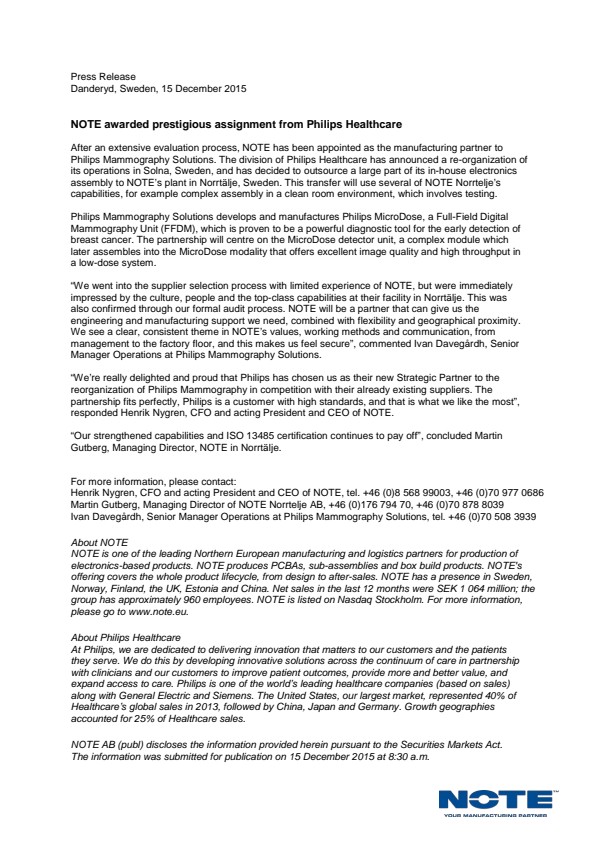 "We're really delighted and proud that Philips has chosen us as their new Strategic Partner to the reorganisation of Philips Mammography in competition with their already existing suppliers. The partnership fits perfectly, Philips is a customer with high standards, and that is what we like the most", responded Henrik Nygren, CFO and acting President and CEO of NOTE.