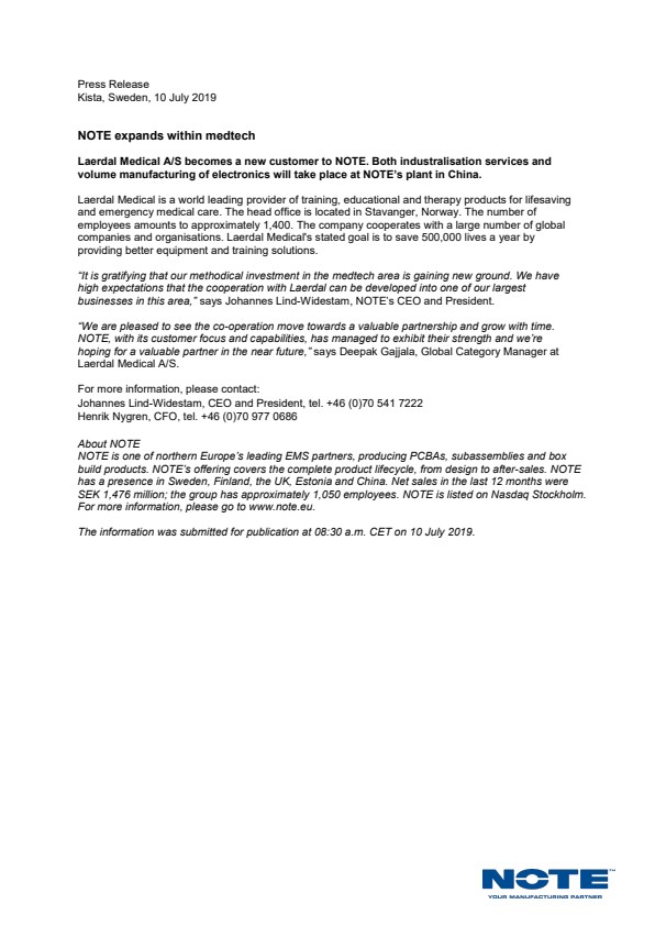"It is gratifying that our methodical investment in the medtech area is gaining new ground. We have high expectations that the co-operation with Laerdal can be developed into one of our largest businesses in this area," says Johannes Lind-Widestam, NOTE's CEO and President.