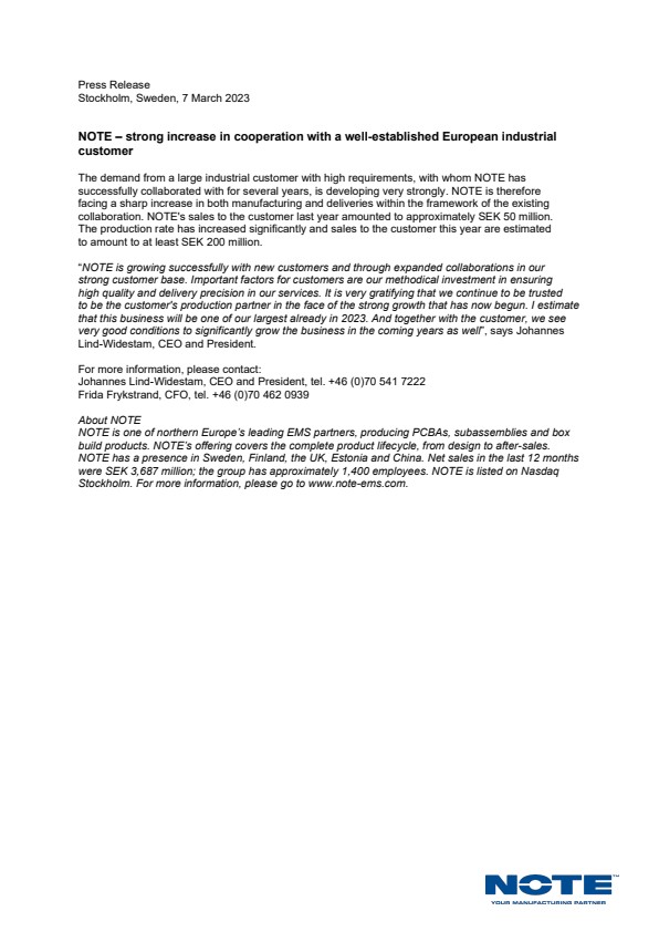 "NOTE is growing successfully with new customers and through expanded collaborations in our strong customer base. Important factors for customers are our methodical investment in ensuring high quality and delivery precision in our services. It is very gratifying that we continue to be trusted to be the customer's production partner in the face of the strong growth that has now begun. I estimate that this business will be one of our largest already in 2023. And together with the customer, we see very good conditions to significantly grow the business in the coming years as well", says Johannes Lind-Widestam, CEO and President.