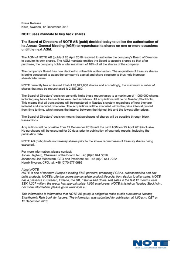 The Board of Directors of NOTE AB (publ) decided today to utilise the authorisation of its Annual General Meeting (AGM) to repurchase its shares on one or more occasions until the next AGM.