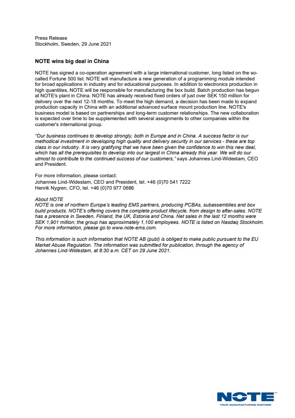 This information is such information that NOTE AB (publ) is obliged to make public pursuant to the EU Market Abuse Regulation. The information was submitted for publication, through the agency of Johannes Lind-Widestam, at 8:30 a.m. CET on 29 June 2021.
