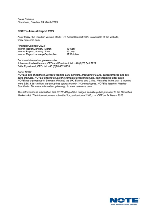 As of today, the Swedish version of NOTE's Annual Report 2022 is available at the website, www.note-ems.com.