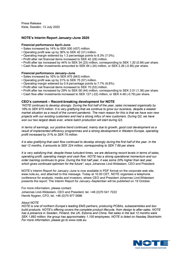 "NOTE continues to develop strongly. During the first half of the year, sales increased organically by 16% to SEK 975 million. It is very gratifying that we continue to grow our business, despite a weaker market situation as a result of the current pandemic. The main reason for this is that we have won new projects with our existing customers and had a strong influx of new customers. During Q2, we have won our two largest deals ever, where batch production will start during Q3.