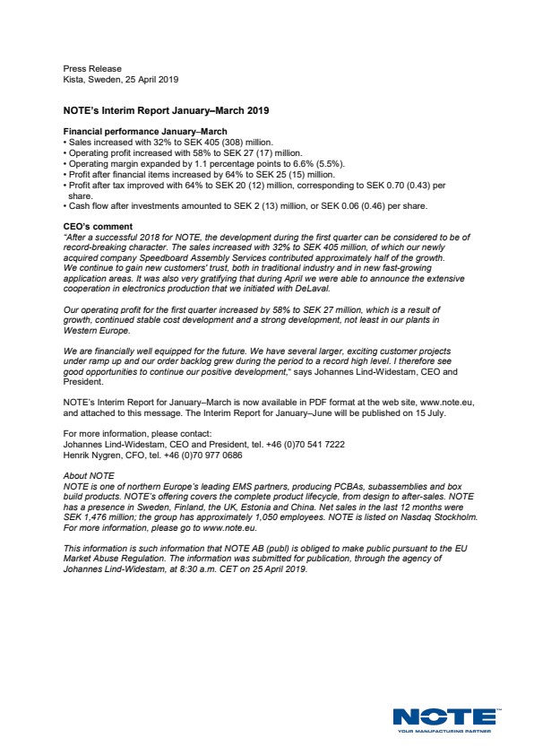 “After a successful 2018 for NOTE, the development during the first quarter can be considered to be of record-breaking character. The sales increased with 32% to SEK 405 million, of which our newly acquired company Speedboard Assembly Services contributed approximately half of the growth. We continue to gain new customers' trust, both in traditional industry and in new fast-growing application areas. It was also very gratifying that during April we were able to announce the extensive cooperation in electronics production that we initiated with DeLaval.