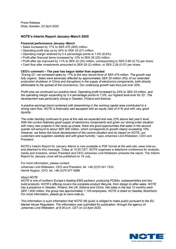 NOTE's Interim Report for January-March is now available in PDF format at the web site, www.note.eu, and attached to this message. Today at 10.00 CET, NOTE organises a telephone conference for analysts, media and investors, where President and CEO Johannes Lind-Widestam presents the report. The Interim Report for January-June will be published on 16 July.