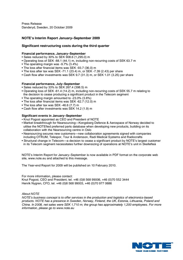 - Structural change in Telecom-a decision to cease a significant product by NOTE's largest customer in its Telecom segment necessitates further downsizing of operations at NOTE's unit in Skellefteå
