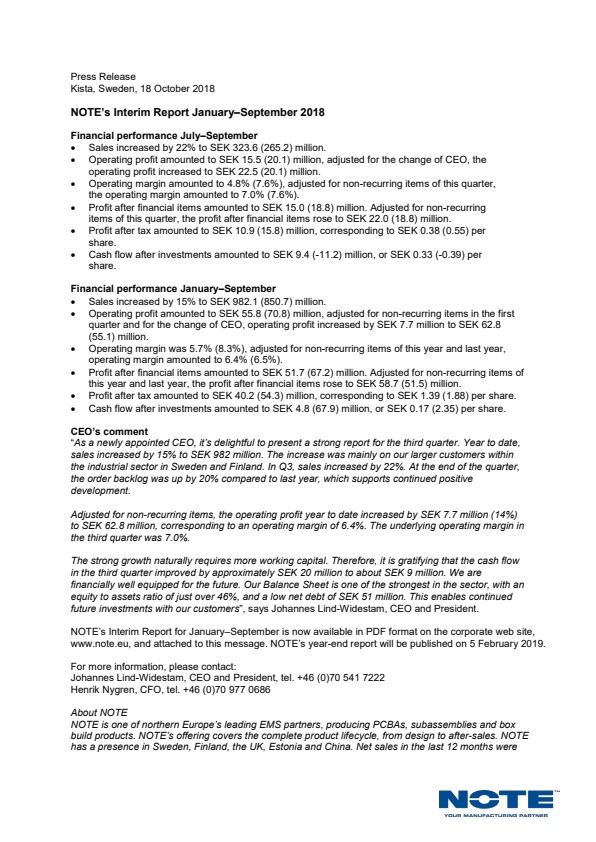 NOTE's Interim Report for January-September is now available in PDF format on the corporate web site, www.note.eu, and attached to this message. NOTE's year-end report will be published on 5 February 2019.