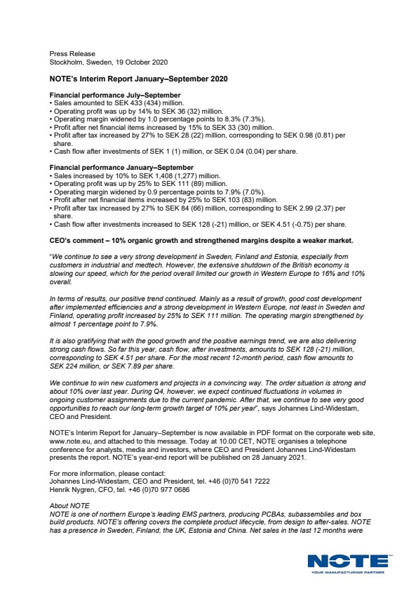 This information is such information that NOTE AB (publ) is obliged to make public pursuant to the EU Market Abuse Regulation. The information was submitted for publication, through the agency of Johannes Lind-Widestam, at 5:30 p.m. at 8:30 a.m. CET on 19 October 2020.