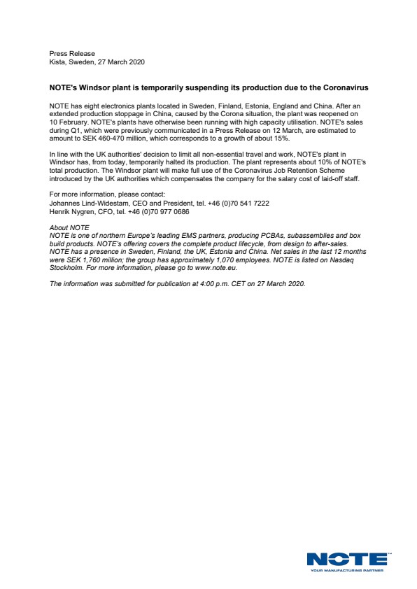In line with the UK authorities' decision to limit all non-essential travel and work, NOTE's plant in Windsor has, from today, temporarily halted its production. The plant represents about 10% of NOTE's total production. The Windsor plant will make full use of the Coronavirus Job Retention Scheme introduced by the UK authorities which compensates the company for the salary cost of laid-off staff.