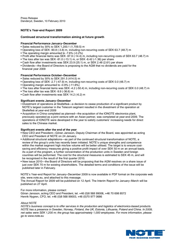 - Additional structural adaptations-as part of the continued structural transformation of NOTE, a review of the group's units has recently been initiated. NOTE's unique strengths and competence within the market segment high mix/low volume will be better utilised. The target is to ensure cost-saving and efficiency measures giving a positive profit impact of over SEK 50 m on an annual basis. As a part of the programme, a further concentration of the production units in Sweden and foreign countries will be performed. The cost for the structural measures is estimated to SEK 45 m, and will be recognised in the result of the first quarter 2010.