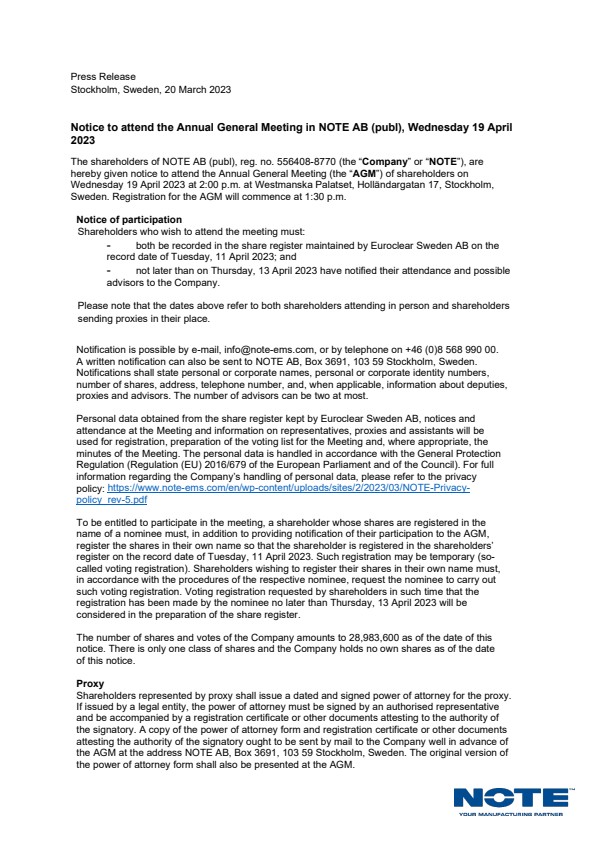 The shareholders of NOTE AB (publ), reg. no. 556408-8770 (the "Company" or "NOTE"), are hereby given notice to attend the Annual General Meeting (the "MGA") of shareholders on Wednesday 19 April 2023 at 2:00 p.m. at Westmanska Palatset, Holländargatan 17, Stockholm, Sweden. Registration for the AGM will commence at 1:30 p.m.
