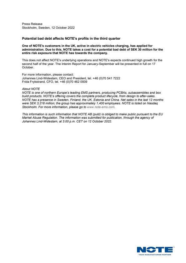 This information is such information that NOTE AB (publ) is obliged to make public pursuant to the EU Market Abuse Regulation. The information was submitted for publication, through the agency of Johannes Lind-Widestam, at 5:30 p.m. CET on 12 October 2022.
