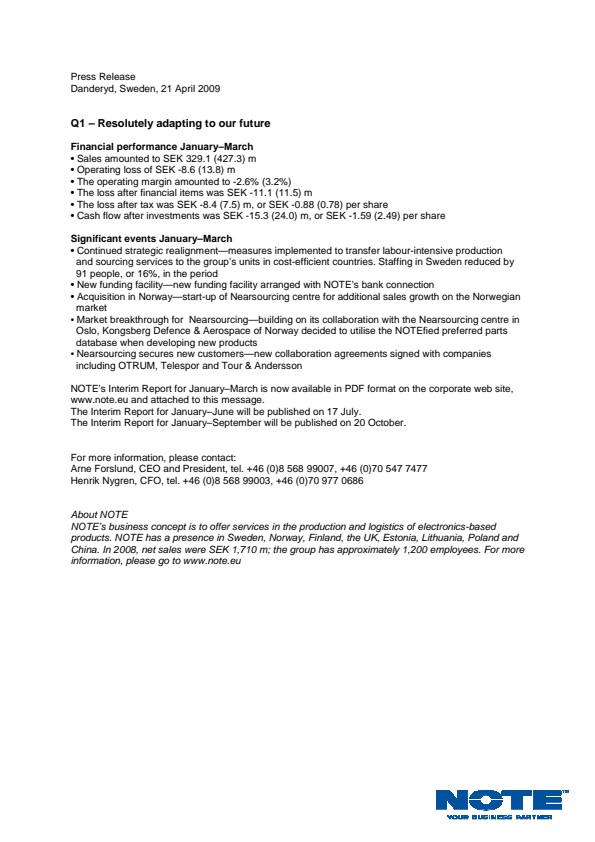 NOTE's Interim Report for January-March is now available in PDF format on the corporate web site, www.note.eu and attached to this message.