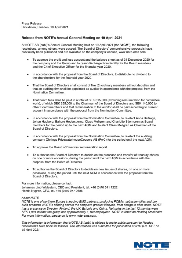 At NOTE AB (publ)’s Annual General Meeting held on 19 April 2021 (the “MGA”), the following resolutions, among others, were passed. The Board of Directors’ comprehensive proposals have previously been published and are available on the company’s website, www.note-ems.com.