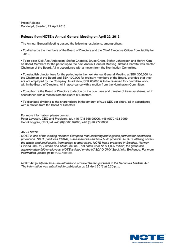 Release from NOTE's Annual General Meeting on April 22, 2013