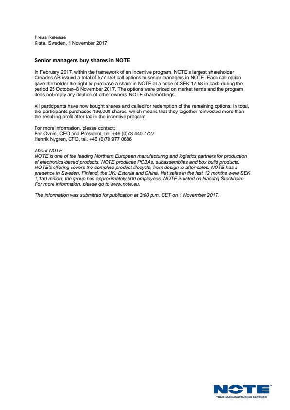 In February 2017, within the framework of an incentive program, NOTE's largest shareholder Creades AB issued a total of 577 453 call options to senior managers in NOTE. Each call option gave the holder the right to purchase a share in NOTE at a price of SEK 17.58 in cash during the period 25 October–8 November 2017. The options were priced on market terms and the program does not imply any dilution of other owners' NOTE shareholdings.