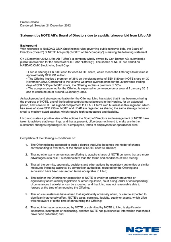 With reference to NASDAQ OMX Stockholm’s rules governing public takeover bids, the Board of Directors (“Board”) of NOTE AB (publ) (“NOTE” or the “company”) is making the following statement.