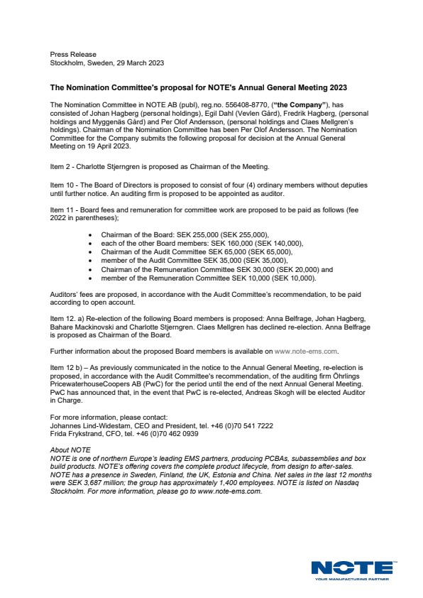 The Nomination Committee in NOTE AB (publ), reg.no. 556408-8770, (“the Company”), has consisted of Johan Hagberg (personal holdings), Egil Dahl (Vevlen Gård), Fredrik Hagberg, (personal holdings and Myggenäs Gård) and Per Olof Andersson, (personal holdings and Claes Mellgren’s holdings). Chairman of the Nomination Committee has been Per Olof Andersson. The Nomination Committee for the Company submits the following proposal for decision at the Annual General Meeting on 19 April 2023.
