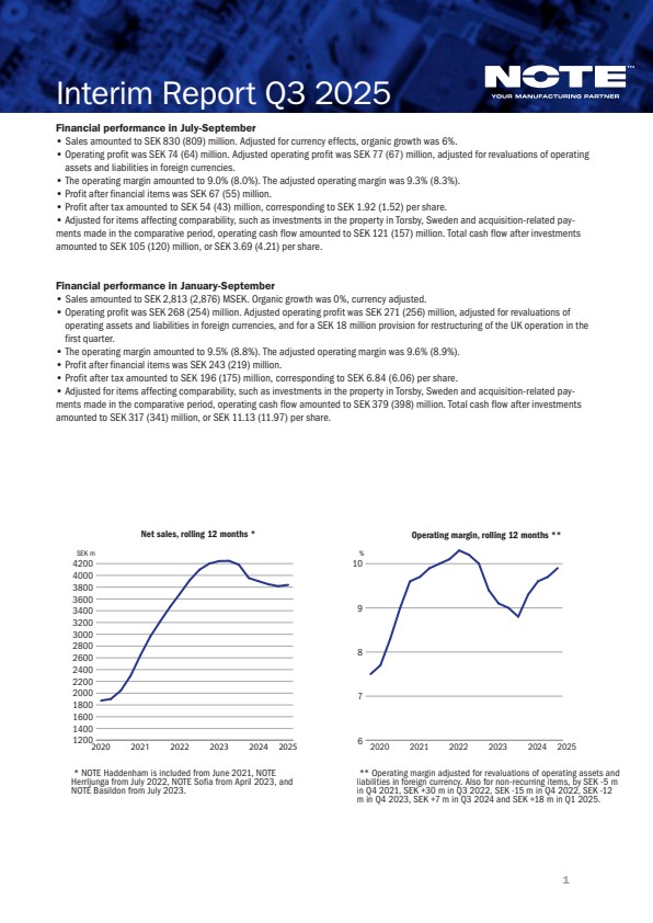 NOTEs Interim Report for Q3 2025 is now available in PDF format on the corporate web site, www.note-ems.com, and attached to this message. Today at 10.00 CET, NOTE organizes a presentaton for analysts, media and investors, where CEO and President Johannes Lind-Widestam presents the report. The Year End Report for January-December will be published on the 26th of January.