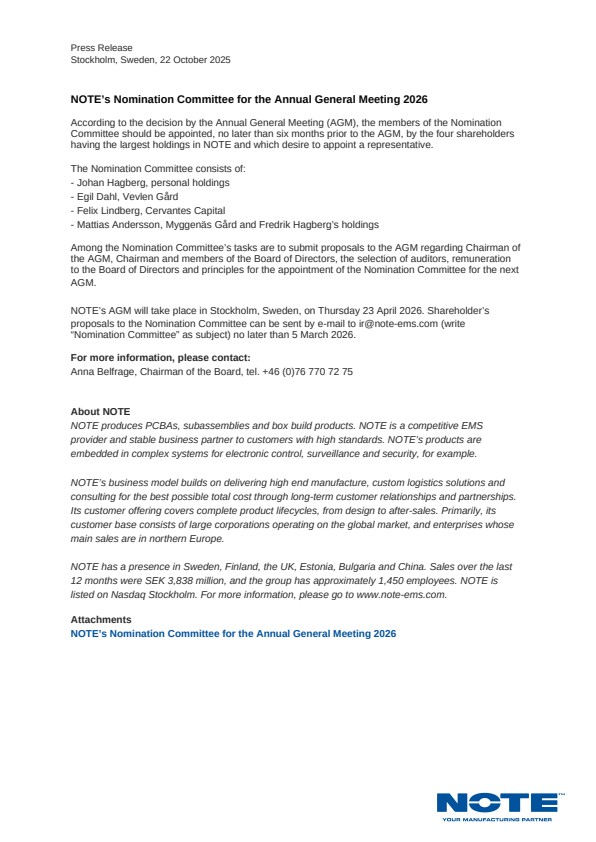 NOTE’s AGM will take place in Stockholm, Sweden, on Thursday 23 April 2026. Shareholder’s proposals to the Nomination Committee can be sent by e-mail to ir@note-ems.com (write “Nomination Committee” as subject) no later than 5 March 2026.