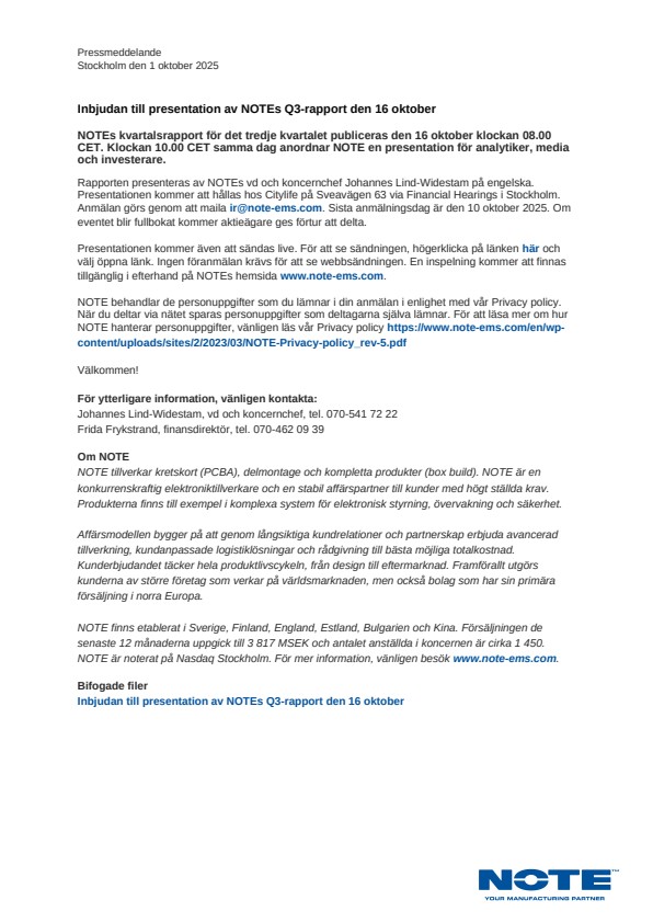 Rapporten presenteras av NOTEs vd och koncernchef Johannes Lind-Widestam på engelska. Presentationen kommer att hållas hos Citylife på Sveavägen 63 via Financial Hearings i Stockholm. Anmälan görs genom att maila ir@note-ems.com. Sista anmälningsdag är den 10 oktober 2025. Om eventet blir fullbokat kommer aktieägare ges förtur att delta.