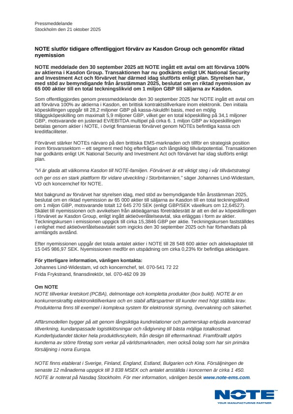 NOTE meddelade den 30 september 2025 att NOTE ingått ett avtal om att förvärva 100% av aktierna i Kasdon Group. Transaktionen har nu godkänts enligt UK National Security and Investment Act och förvärvet har därmed idag slutförts enligt plan. Styrelsen har, med stöd av bemyndigande från årsstämman 2025, beslutat om en riktad nyemission av 65 000 aktier till en total teckningslikvid om 1 miljon GBP till säljarna av Kasdon.