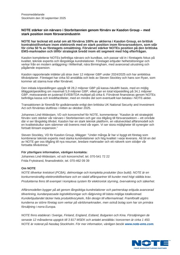 Johannes Lind-Widestam, VD och koncernchef för NOTE, kommenterar: ”Kasdon är ett strategiskt förvärv som stärker vår närvaro i Storbritannien och ger oss tillgång till försvarssektorn – ett område där vi ser långsiktig tillväxt. Kasdon har en stark teknisk plattform, en välutvecklad affärsmodell och en kvalitetskultur som stämmer väl överens med vår egen. Vi ser stora möjligheter till synergier och fortsatt lönsam expansion.”