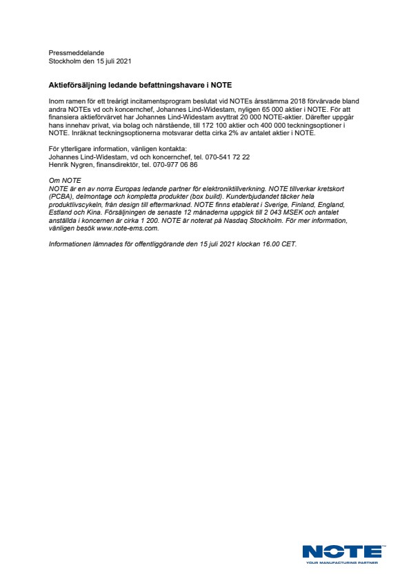 Inom ramen för ett treårigt incitamentsprogram beslutat vid NOTEs årsstämma 2018 förvärvade bland andra NOTEs vd och koncernchef, Johannes Lind-Widestam, nyligen 65 000 aktier i NOTE. För att finansiera aktieförvärvet har Johannes Lind-Widestam avyttrat 20 000 NOTE-aktier. Därefter uppgår hans innehav privat, via bolag och närstående, till 172 100 aktier och 400 000 teckningsoptioner i NOTE. Inräknat teckningsoptionerna motsvarar detta cirka 2% av antalet aktier i NOTE.