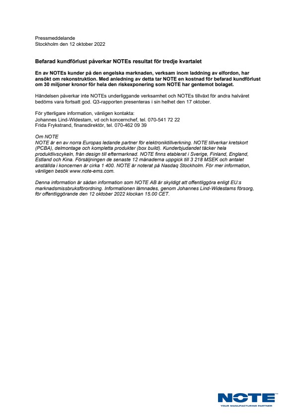 Denna information är sådan information som NOTE AB är skyldigt att offentliggöra enligt EU:s marknadsmissbruksförordning. Informationen lämnades, genom Johannes Lind-Widestams försorg, för offentliggörande den 12 oktober 2022 klockan 15.00 CET.