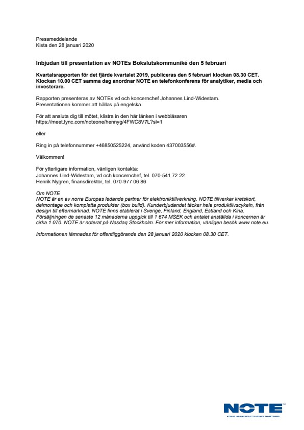 Kvartalsrapporten för det fjärde kvartalet 2019, publiceras den 5 februari klockan 08.30 CET. Klockan 10.00 CET samma dag anordnar NOTE en telefonkonferens för analytiker, media och investerare.