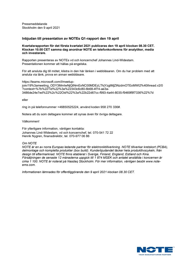 Kvartalsrapporten för det första kvartalet 2021 publiceras den 19 april klockan 08.30 CET. Klockan 10.00 CET samma dag anordnar NOTE en telefonkonferens för analytiker, media och investerare.