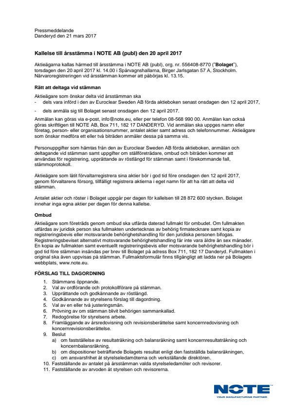 Aktieägarna kallas härmed till årsstämma i NOTE AB (publ), org. nr. 556408-8770 (”Bolaget”), torsdagen den 20 april 2017 kl. 14.00 i Spårvagnshallarna, Birger Jarlsgatan 57 A, Stockholm. Närvaroregistreringen vid årsstämman kommer att påbörjas kl. 13.15.