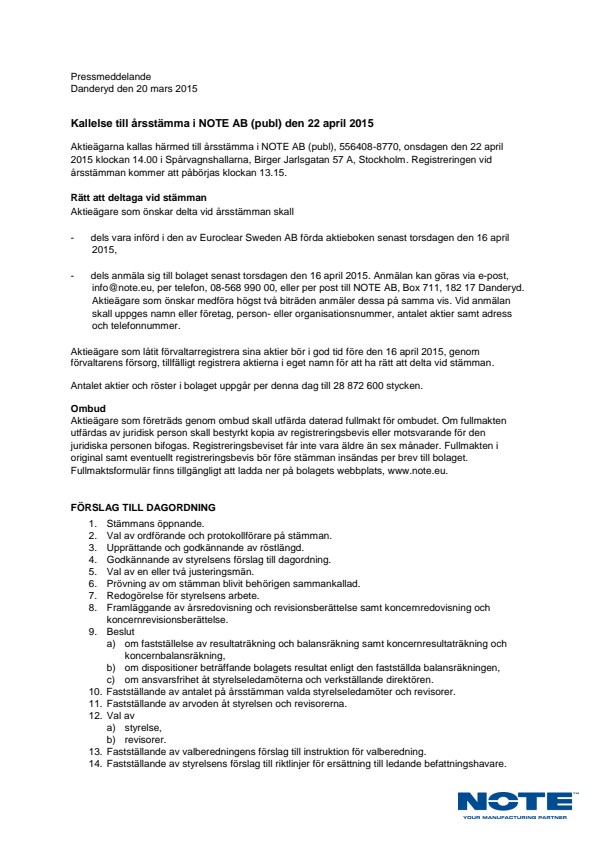 Aktieägarna kallas härmed till årsstämma i NOTE AB (publ), 556408-8770, onsdagen den 22 april 2015 klockan 14.00 i Spårvagnshallarna, Birger Jarlsgatan 57 A, Stockholm. Registreringen vid årsstämman kommer att påbörjas klockan 13.15.