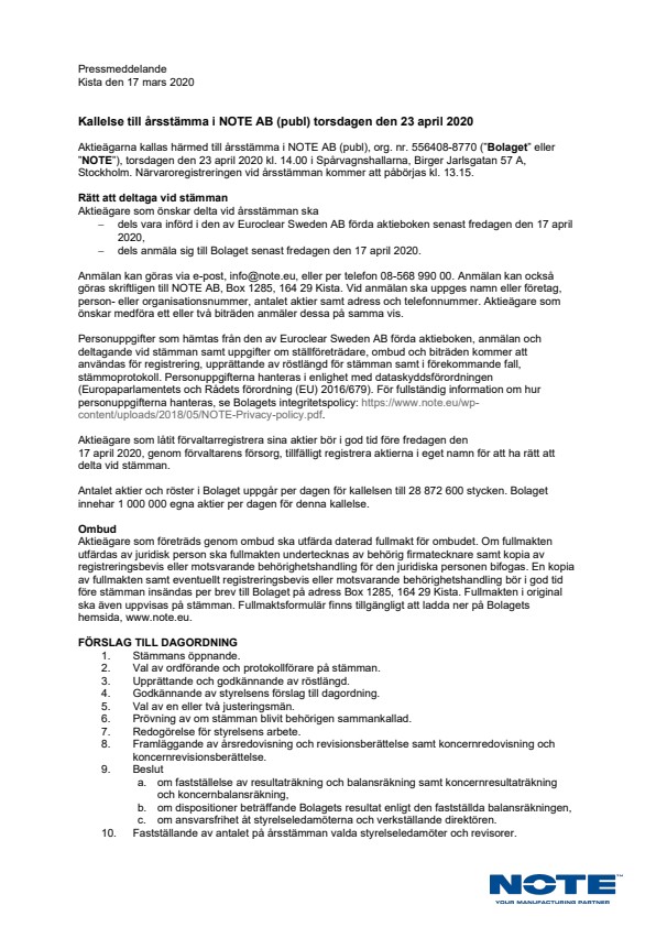 Aktieägarna kallas härmed till årsstämma i NOTE AB (publ), org. nr. 556408-8770 (”Bolaget” eller ”NOTE”), torsdagen den 23 april 2020 kl. 14.00 i Spårvagnshallarna, Birger Jarlsgatan 57 A, Stockholm. Närvaroregistreringen vid årsstämman kommer att påbörjas kl. 13.15.