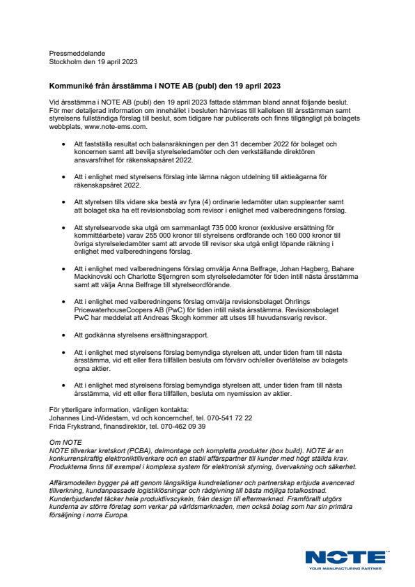Vid årsstämma i NOTE AB (publ) den 19 april 2023 fattade stämman bland annat följande beslut. För mer detaljerad information om innehållet i besluten hänvisas till kallelsen till årsstämman samt styrelsens fullständiga förslag till beslut, som tidigare har publicerats och finns tillgängligt på bolagets webbplats, www.note-ems.com.