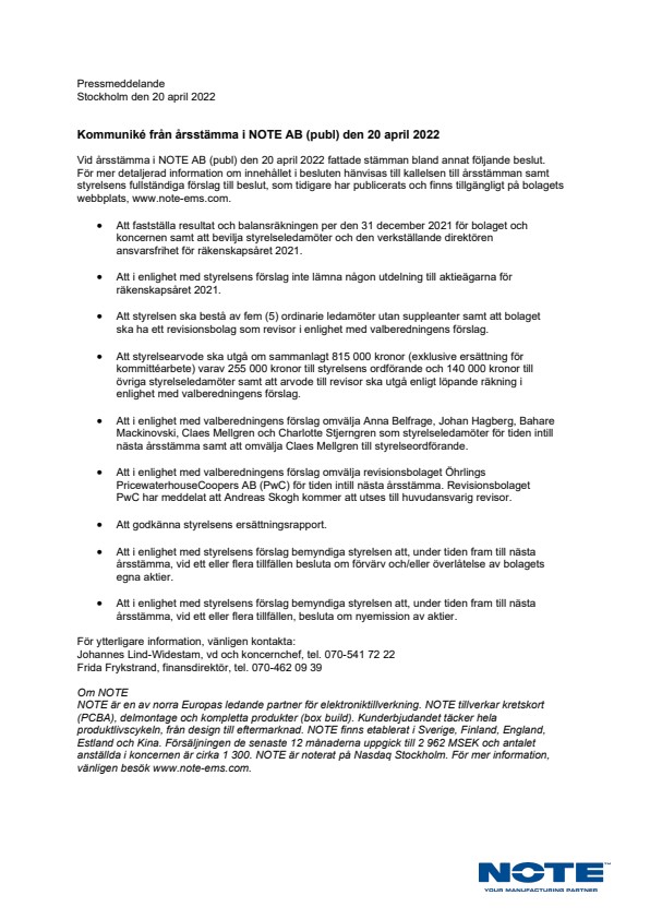 Vid årsstämma i NOTE AB (publ) den 20 april 2022 fattade stämman bland annat följande beslut. För mer detaljerad information om innehållet i besluten hänvisas till kallelsen till årsstämman samt styrelsens fullständiga förslag till beslut, som tidigare har publicerats och finns tillgängligt på bolagets webbplats, www.note-ems.com.