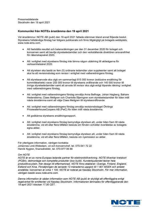 Vid årsstämma i NOTE AB (publ) den 19 april 2021 fattade stämman bland annat följande beslut. Styrelsens fullständiga förslag har tidigare publicerats och finns tillgängligt på bolagets webbplats, www.note-ems.com.