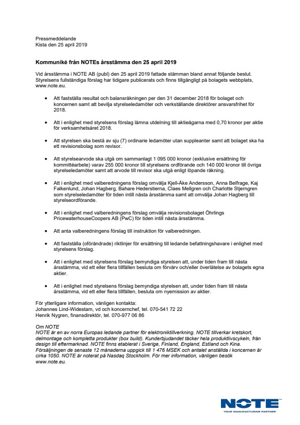 Vid årsstämma i NOTE AB (publ) den 25 april 2019 fattade stämman bland annat följande beslut. Styrelsens fullständiga förslag har tidigare publicerats och finns tillgängligt på bolagets webbplats, www.note.eu.