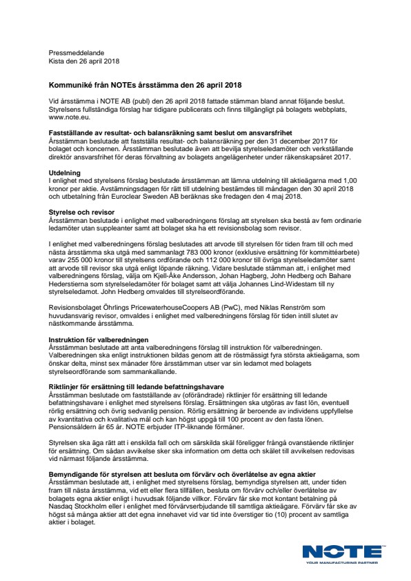 Vid årsstämma i NOTE AB (publ) den 26 april 2018 fattade stämman bland annat följande beslut. Styrelsens fullständiga förslag har tidigare publicerats och finns tillgängligt på bolagets webbplats, www.note.eu.