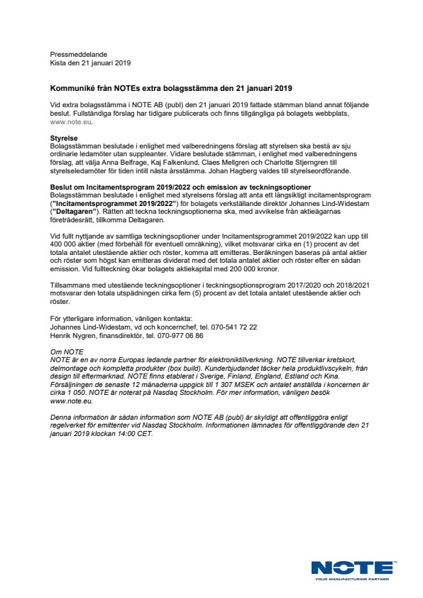 Vid extra bolagsstämma i NOTE AB (publ) den 21 januari 2019 fattade stämman bland annat följande beslut. Fullständiga förslag har tidigare publicerats och finns tillgängliga på bolagets webbplats, www.note.eu.