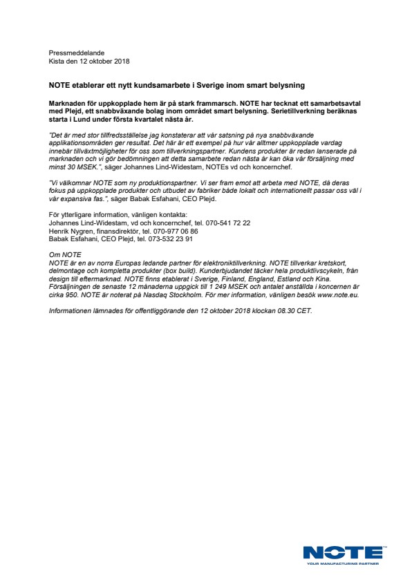NOTE är en av norra Europas ledande partner för elektroniktillverkning. NOTE tillverkar kretskort, delmontage och kompletta produkter (box build). Kunderbjudandet täcker hela produktlivscykeln, från design till eftermarknad. NOTE finns etablerat i Sverige, Finland, England, Estland och Kina. Försäljningen de senaste 12 månaderna uppgick till 1 249 MSEK och antalet anställda i koncernen är cirka 950. NOTE är noterat på Nasdaq Stockholm. För mer information, vänligen besök www.note.eu.