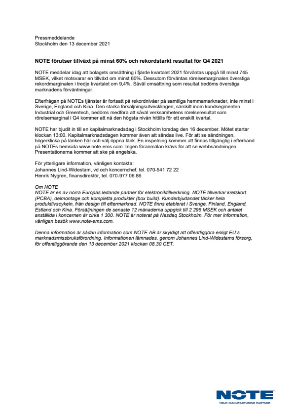 Denna information är sådan information som NOTE AB är skyldigt att offentliggöra enligt EU:s marknadsmissbruksförordning. Informationen lämnades, genom Johannes Lind-Widestams försorg, för offentliggörande den 13 december 2021 klockan 08.30 CET.
