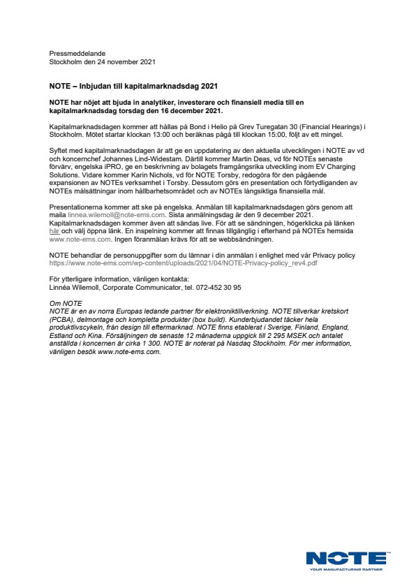Presentationerna kommer att ske på engelska. Anmälan till kapitalmarknadsdagen görs genom att maila linnea.wilemoll@note-ems.com. Sista anmälningsdag är den 9 december 2021. Kapitalmarknadsdagen kommer även att sändas live. För att se sändningen, högerklicka på länken här och välj öppna länk. En inspelning kommer att finnas tillgänglig i efterhand på NOTEs hemsida www.note-ems.com. Ingen föranmälan krävs för att se webbsändningen.